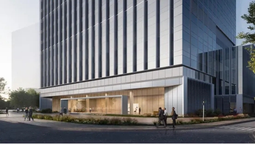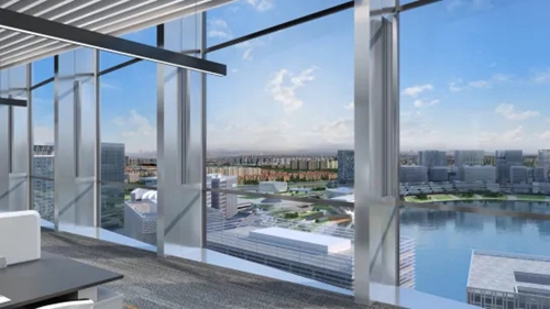 城發(fā)中心以“嵩山書頁巖”為設(shè)計(jì)理念,以中空LOW-E玻璃打造極簡(jiǎn)幕墻立面,玻璃寬約3米,隱藏式開啟窗。