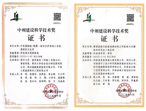 鄭州城建集團(tuán)的“擴(kuò)體預(yù)制樁—帷幕一體化支護(hù)結(jié)構(gòu)工作機理研究與應(yīng)用”與“新型裝配式樁板道路結(jié)構(gòu)工作機制與關(guān)鍵技術(shù)研究及工程應(yīng)用”兩項科研項目,分獲河南省“中州建設(shè)科學(xué)技術(shù)獎”特等獎和一等獎。